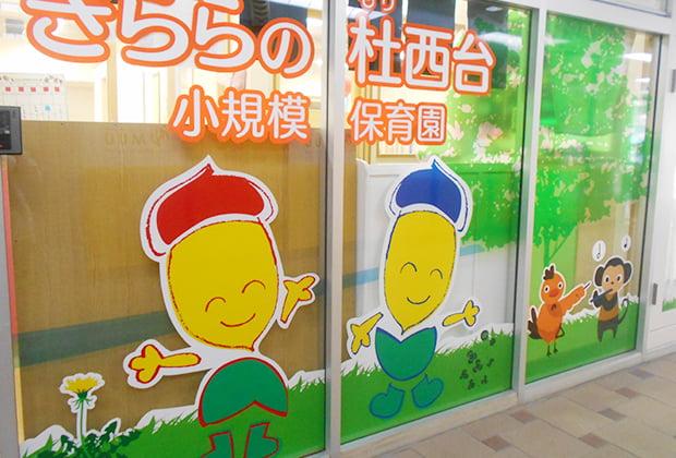 レンガと木の温もりを感じる園舎の中は、居心地の良い空間が広がっています。柔らかな色使いの壁、壁や教室の入り口に描かれたかわいいイラスト、壁に設置された知育玩具などは、子どもはもちろん、職員の気持ちまで明るくしてくれるでしょう。